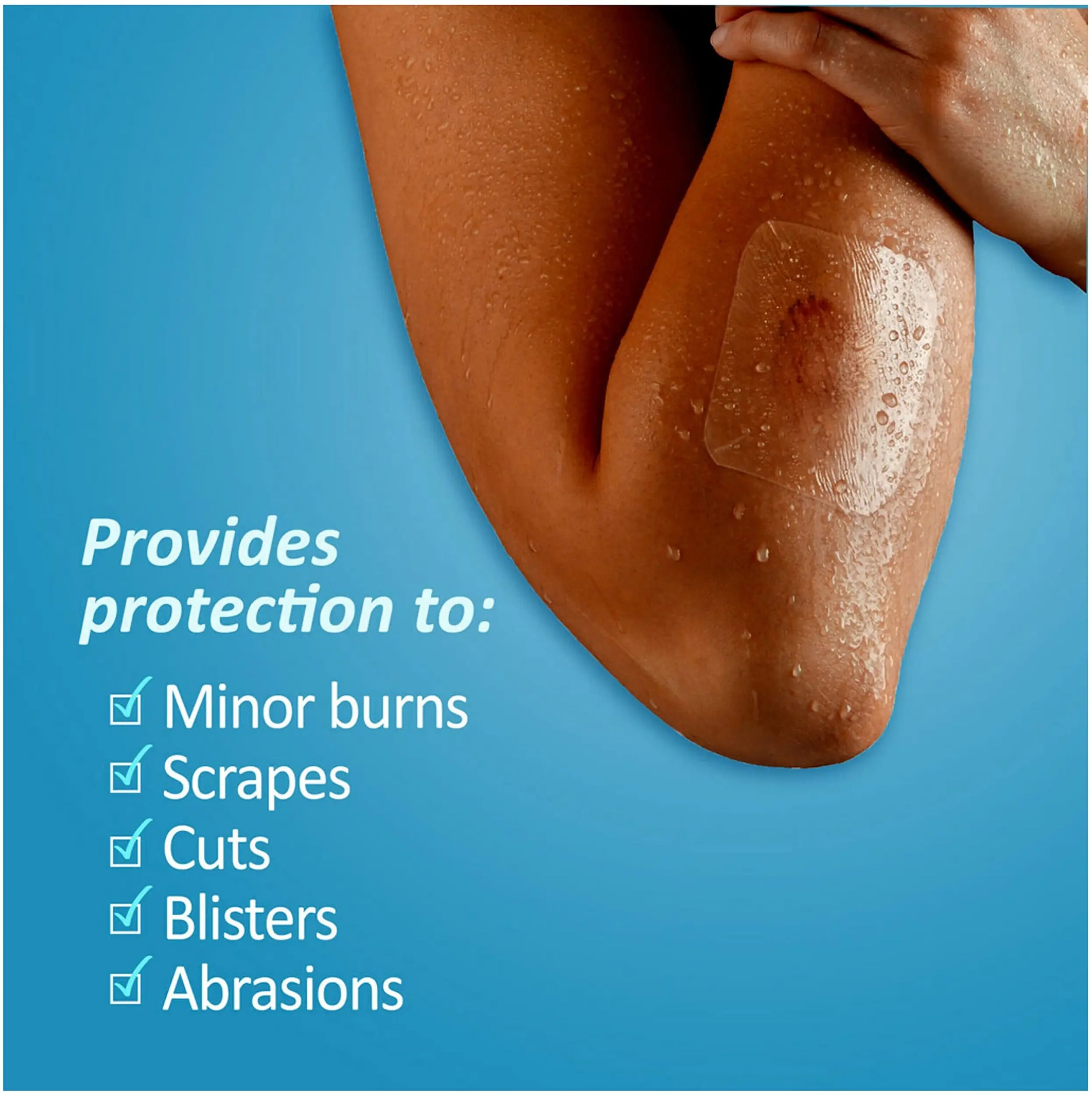 Designed to provide superior protection for minor burns, scrapes, cuts, blisters, and abrasions. The transparent film allows for easy wound monitoring without removing the dressing.