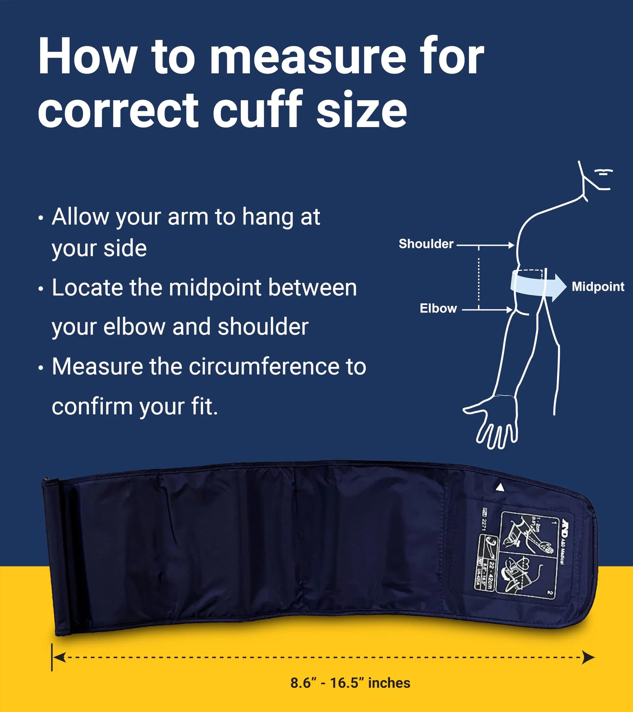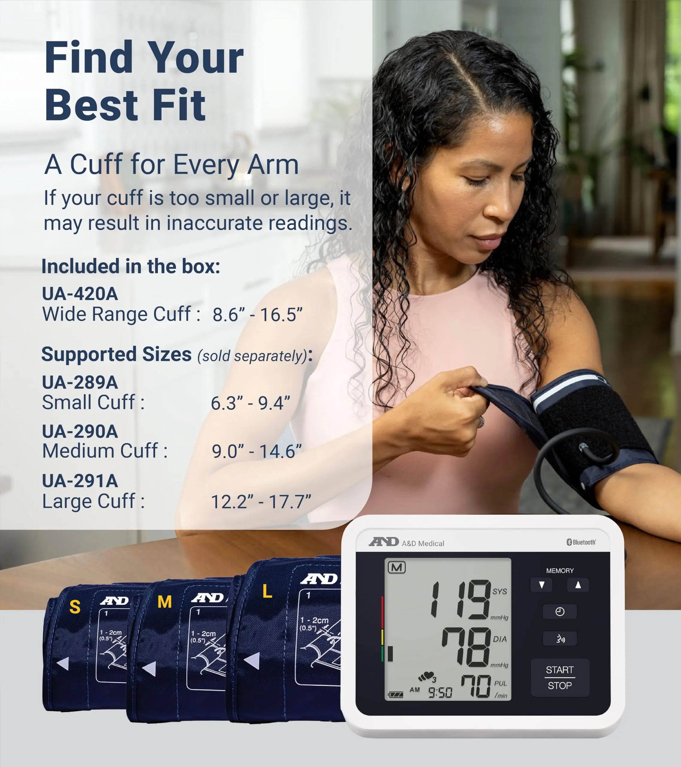The included wide-range cuff comfortably fits most upper arms (8.6-16.5 inches) and features adjustable pressure settings for personalized comfort. For optimal fit, the monitor is compatible with optional A&D Medical small, medium, and large cuffs (sold separately).