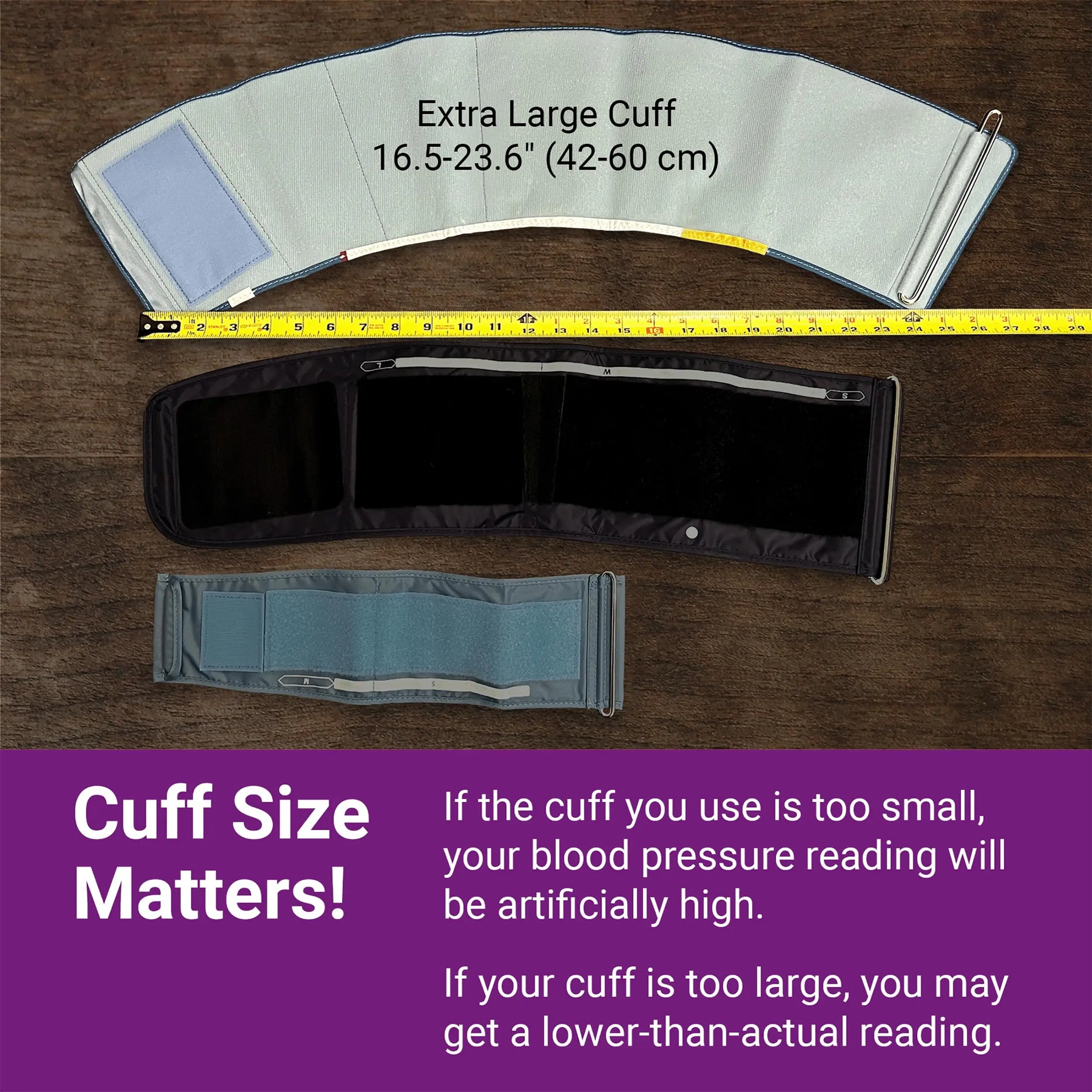 The UA-789AC blood pressure monitor delivers trusted accuracy with its included extra-large cuff (16.5-23.6"/42-60cm), ensuring proper fit and precise measurements for users with larger arms. The device is also compatible with optional medium and large cuffs for versatile use.