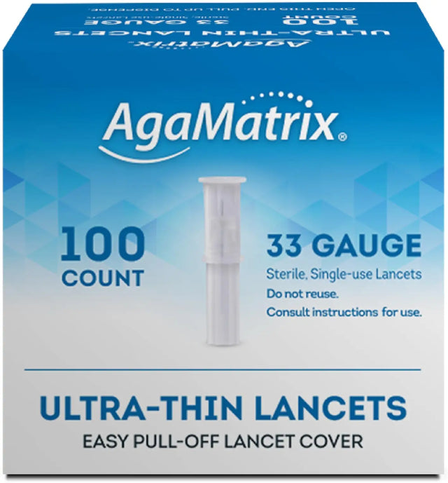 Experience virtually pain-free blood glucose testing with AgaMatrix Ultra-Thin Lancets. This convenient box of 100 sterile lancets provides a reliable supply for your daily diabetes management needs.