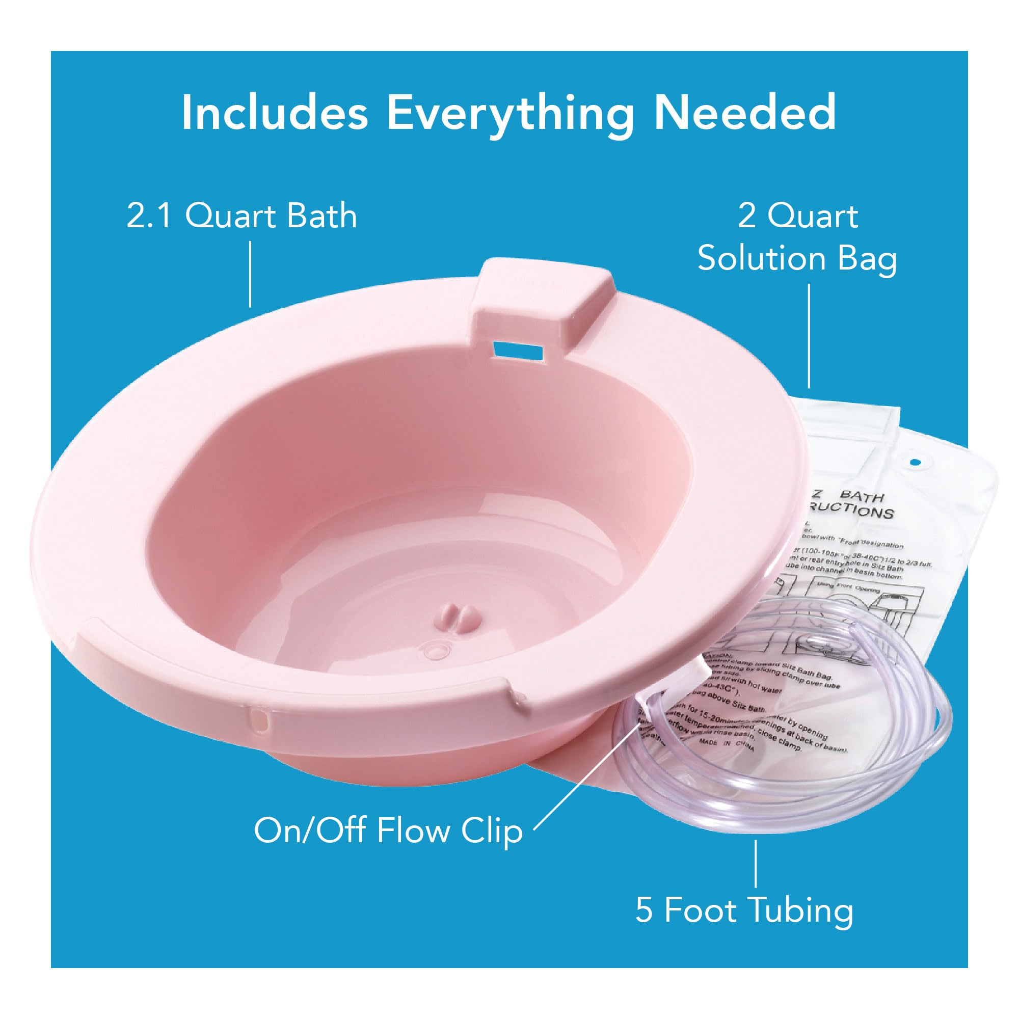 This comprehensive sitz bath set includes everything you need for effective perineal care and comfort. The package contains one 2.1-quart basin, one 2-quart solution bag, and one 5-foot tube for convenient use.