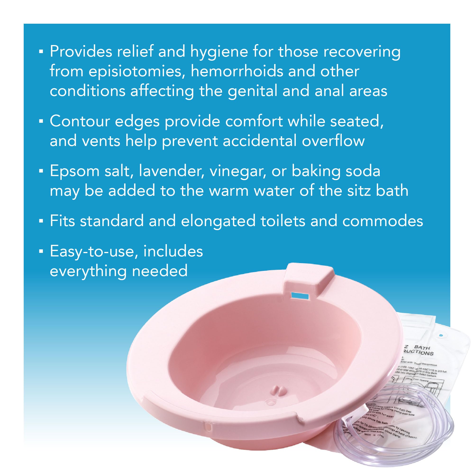 Ideal for providing relief for post-episiotomy patients, hemorrhoid sufferers, and individuals experiencing post-partum discomfort. The sitz bath effectively addresses pain, itching, and discomfort in the perineal, anal, or genital areas.