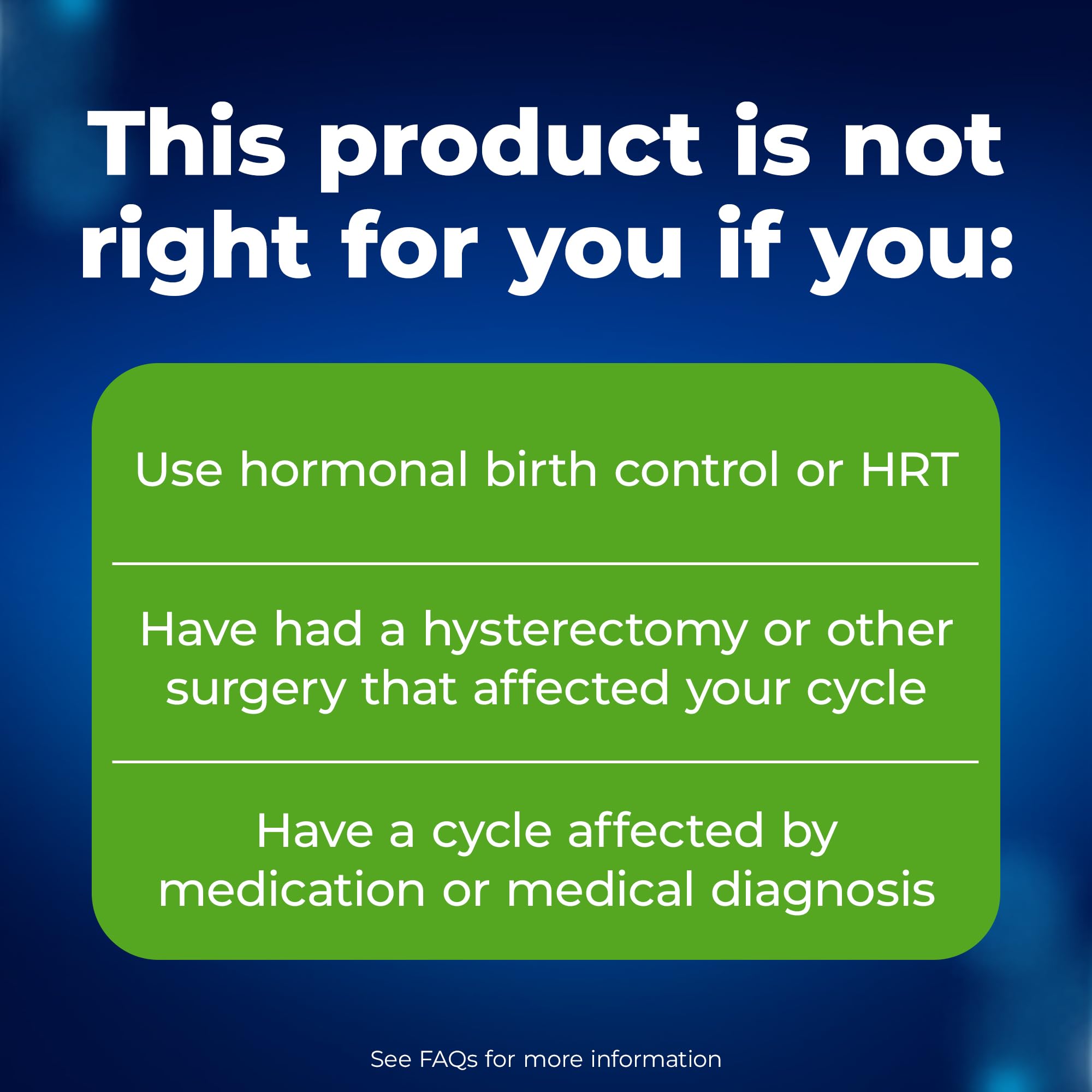 This product is not suitable if you are pregnant, breastfeeding, using hormonal birth control, hormone replacement therapy, medications affecting FSH, have PCOS, or after surgical procedures affecting your cycle. Always consult with your healthcare provider for personalized medical advice.
