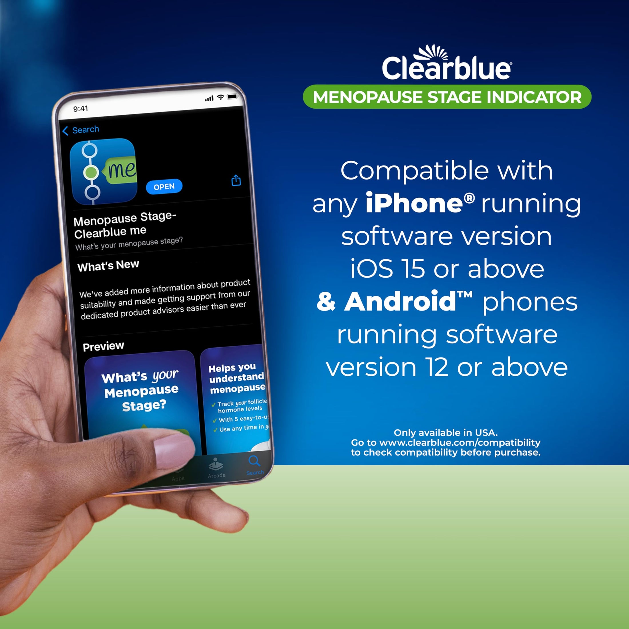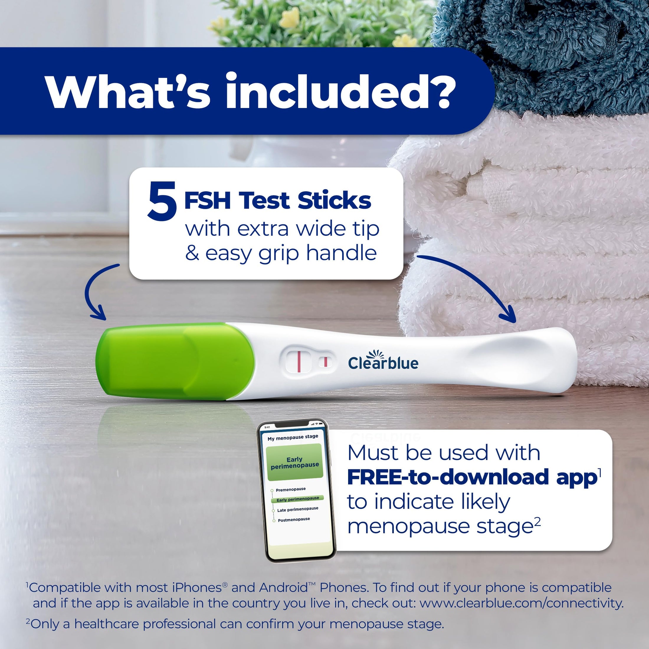 The Clearblue Menopause Stage Indicator combines 5 FSH test results with your age and cycle history to indicate your likely menopause stage: premenopause, early perimenopause, late perimenopause, or postmenopause. This information helps you feel better prepared and informed about your health journey.