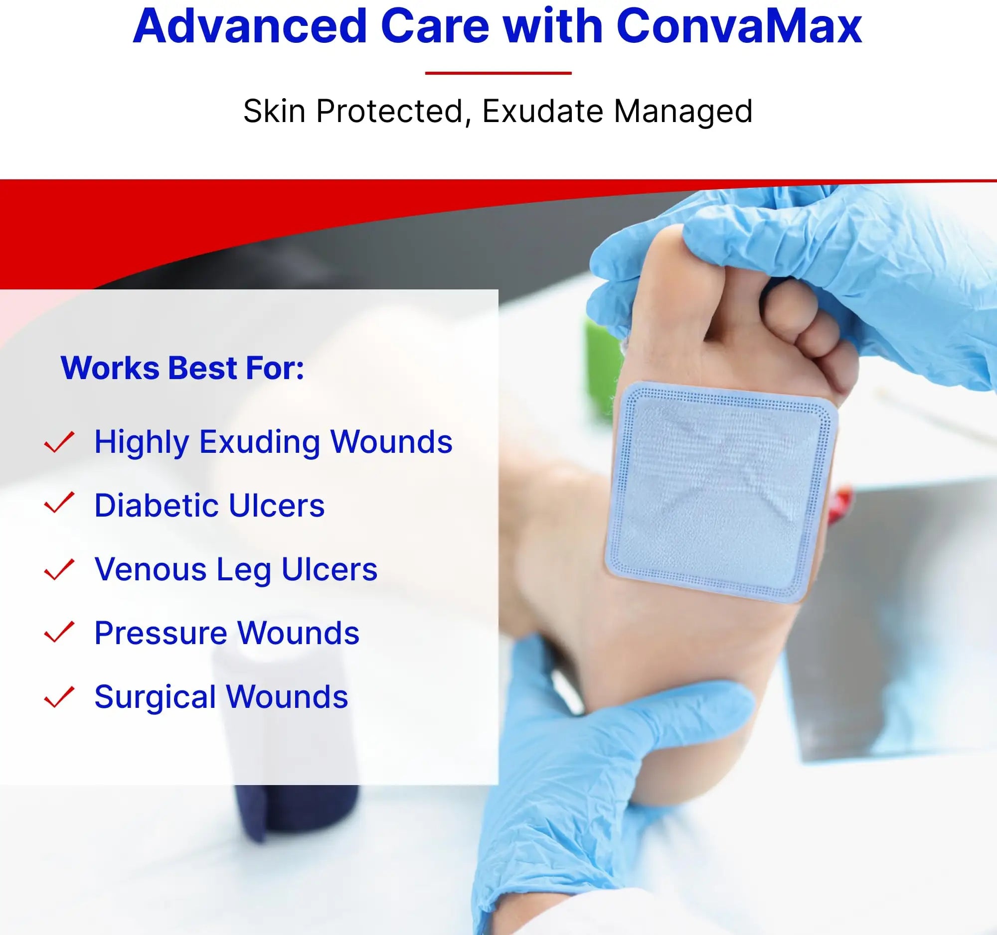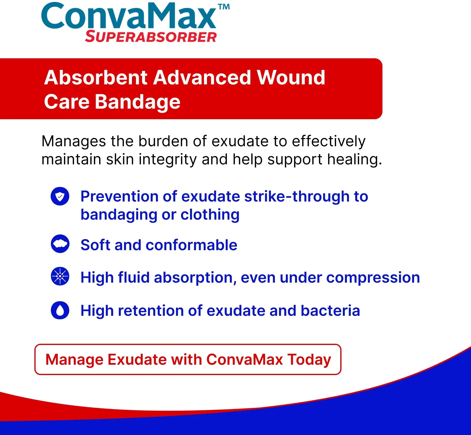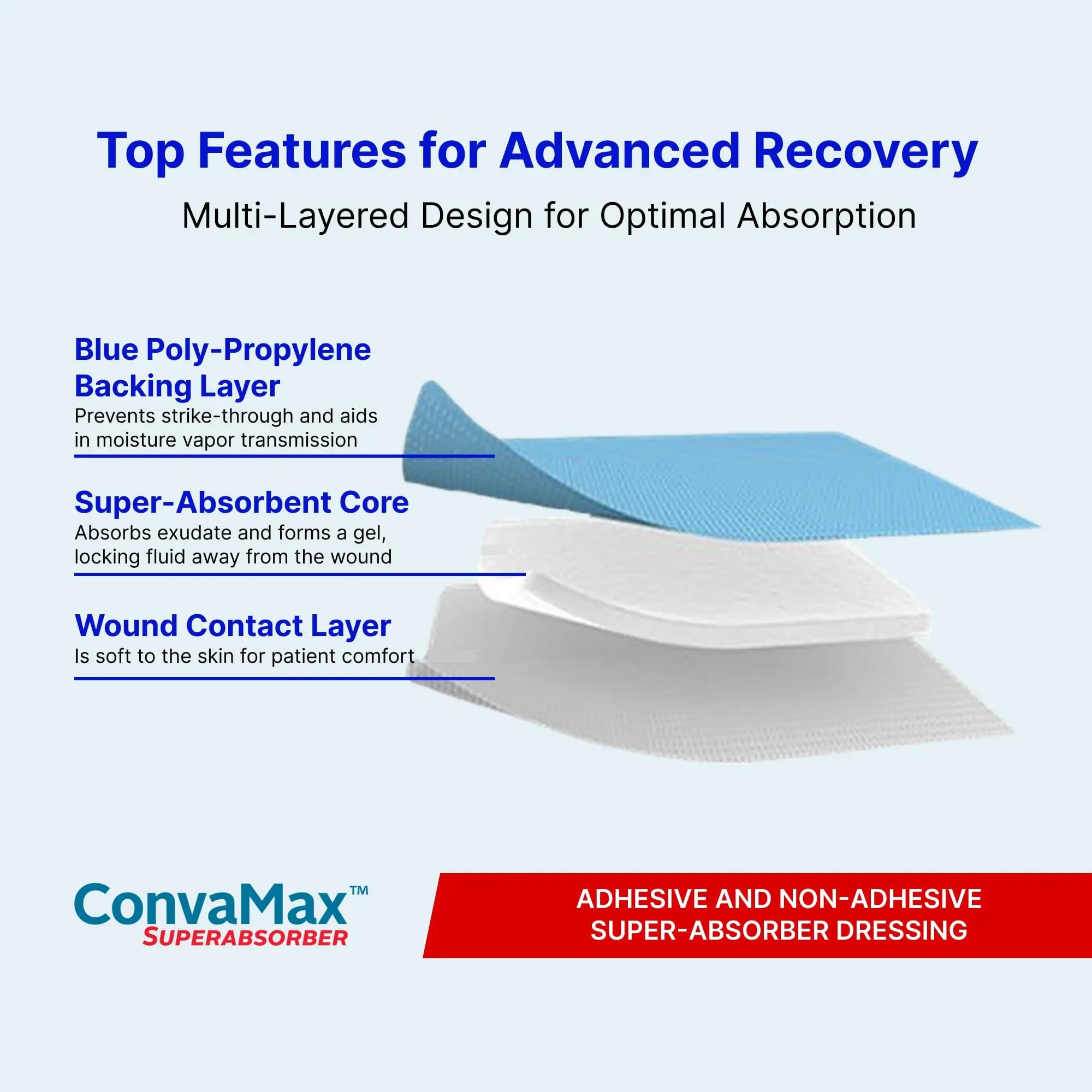The ConvaMax dressing incorporates innovative superabsorbent technology that locks away excess exudate while maintaining the ideal moist wound environment necessary for faster healing. The unique multi-layer design ensures optimal fluid management and protection.