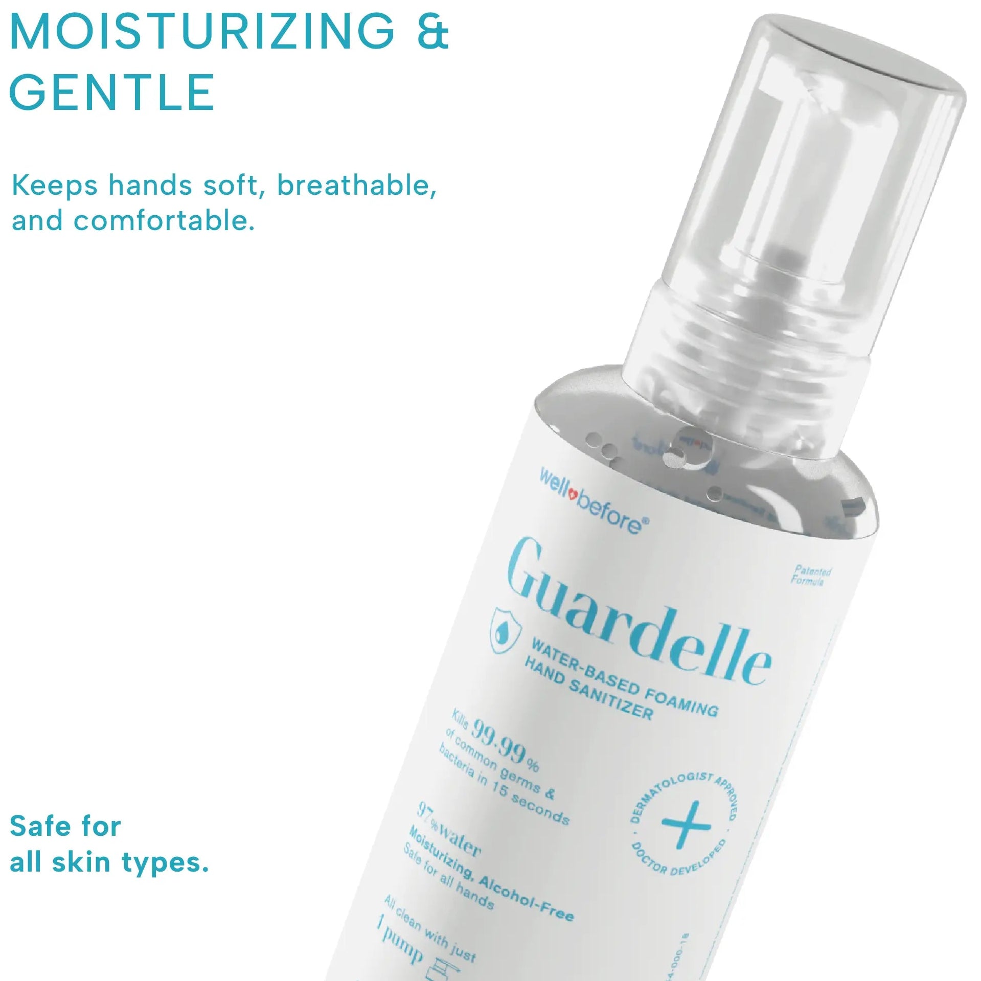 Experience a new kind of clean with Guardelle - the doctor-developed, dermatologist-recommended hand sanitizer made with 97% water and 0% alcohol. Our patented micro-foam spreads like a soft cloud, dries in seconds, and leaves hands feeling comforted and hydrated - never tight, never irritated, and never burning, even on sensitive skin.