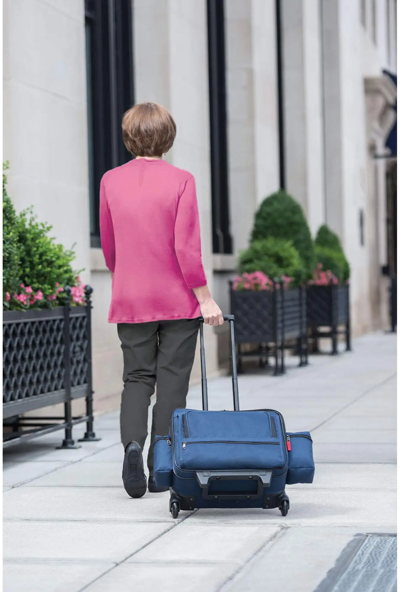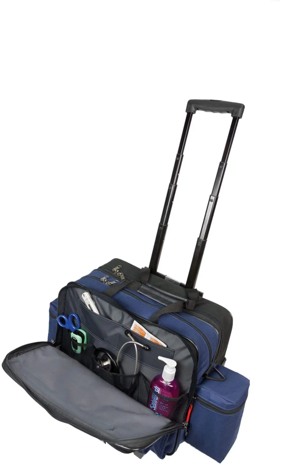 Designed for mobility with a 39.5-inch telescoping handle and adjustable nonslip shoulder strap. The extra-wide wheels provide smooth rolling across various surfaces, making it ideal for healthcare professionals on the move.