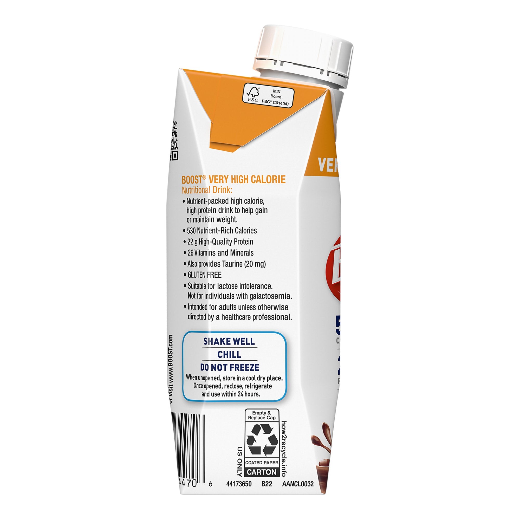 This single 8 oz carton of Nestle Boost VHC provides a concentrated source of nutrition with 530 calories per serving, designed to support weight gain and nutritional needs for adults.