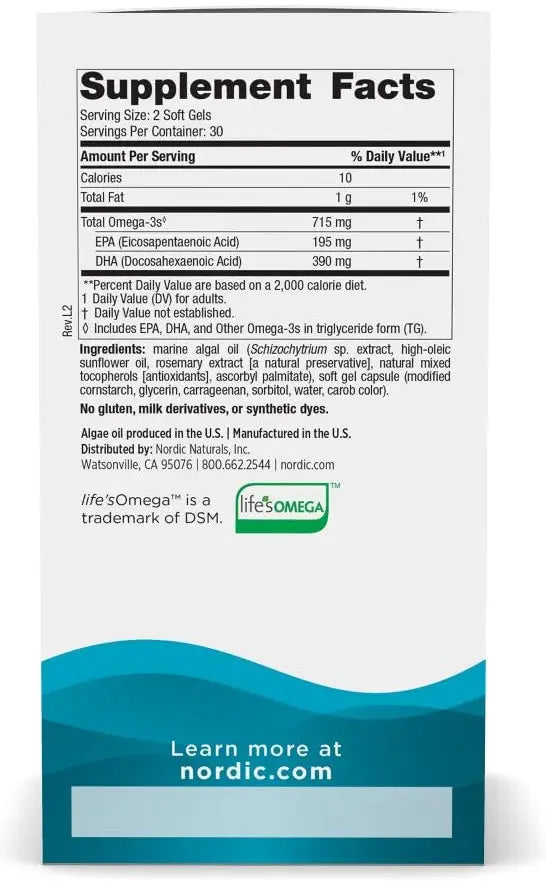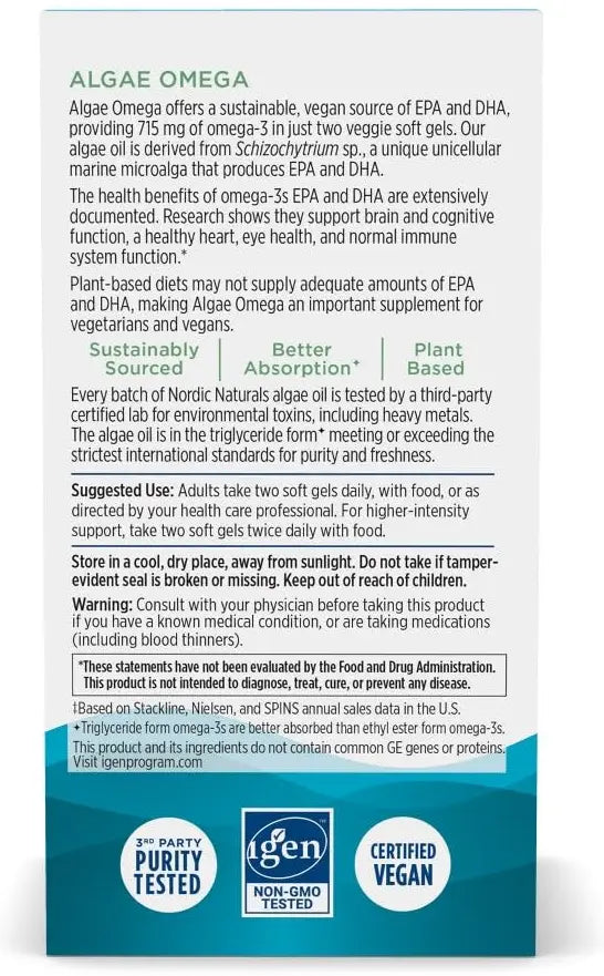 Discover the power of plant-based omega-3s with Nordic Naturals Algae Omega. This premium 60-count supplement provides essential fatty acids EPA and DHA derived from sustainable microalgae, offering a fish-free alternative that supports heart, brain, eye, and immune health.