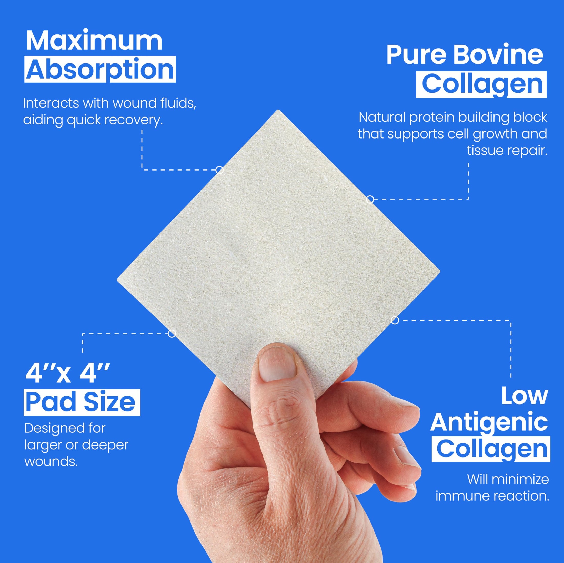 Experience superior wound healing with our premium collagen pad dressings. Each box contains 5 individual 4x4 inch pads that can be easily cut to fit your specific wound requirements. These innovative dressings are designed to support your body's natural healing process while providing exceptional comfort and protection.
