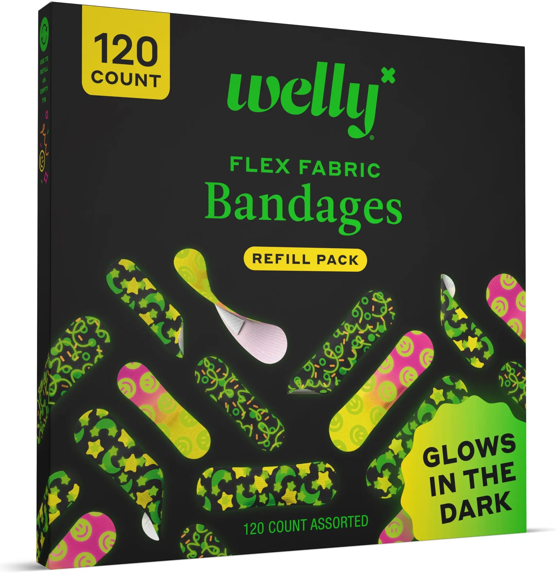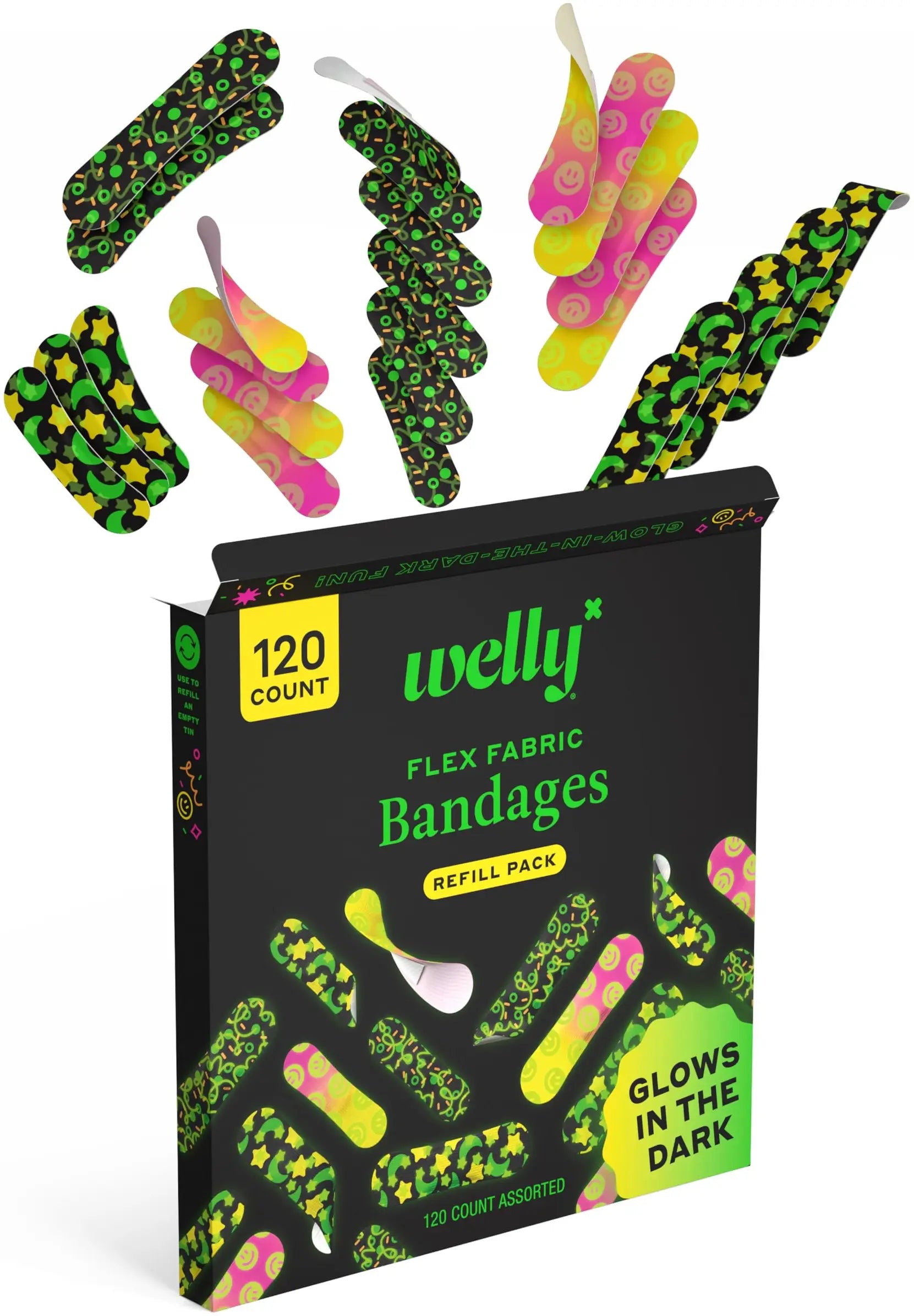 This comprehensive box contains 120 glow-in-the-dark flex fabric bandages that bring fun and functionality to first aid. Perfect for refilling your empty Welly tin, these bandages combine throwback neon charm with nighttime excitement.