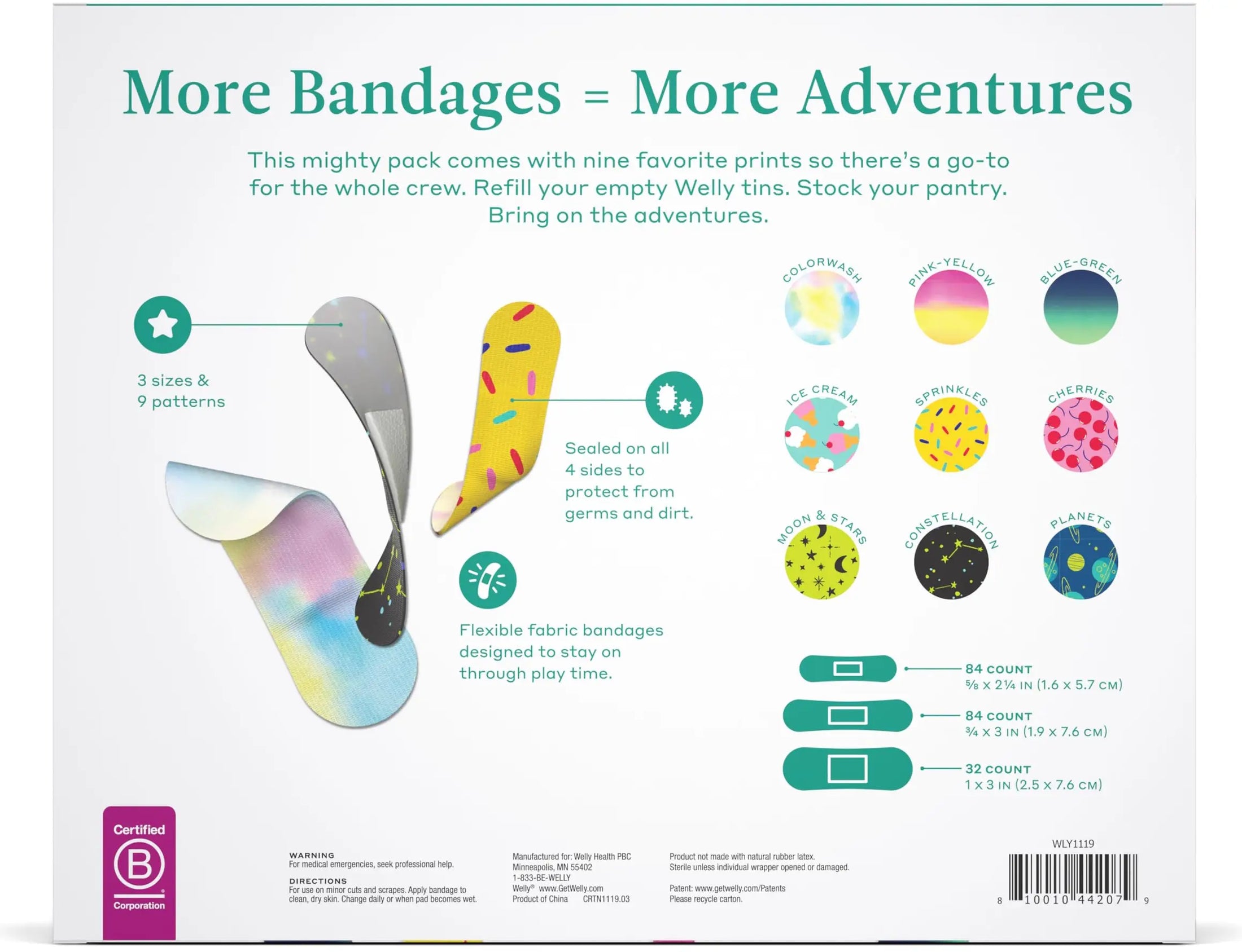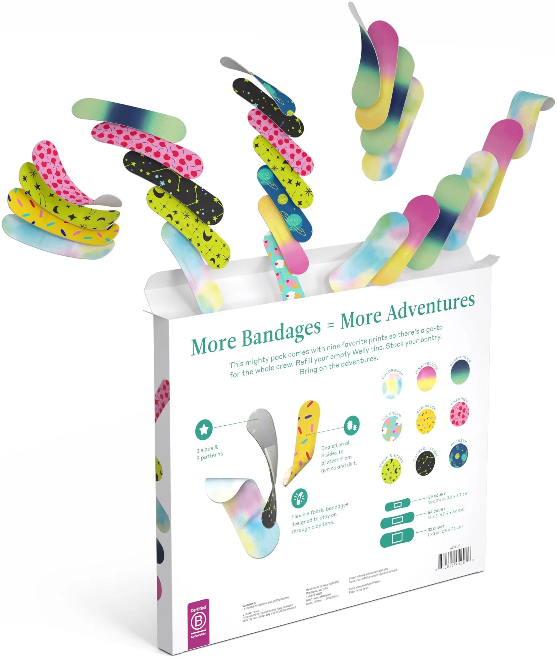More bandages = more adventures. This mighty 200-count pack comes with nine favorite patterns in three different sizes so there's a go-to for the whole crew. Perfect for refilling your empty Welly tins, stocking your pantry, and bringing on the fun!